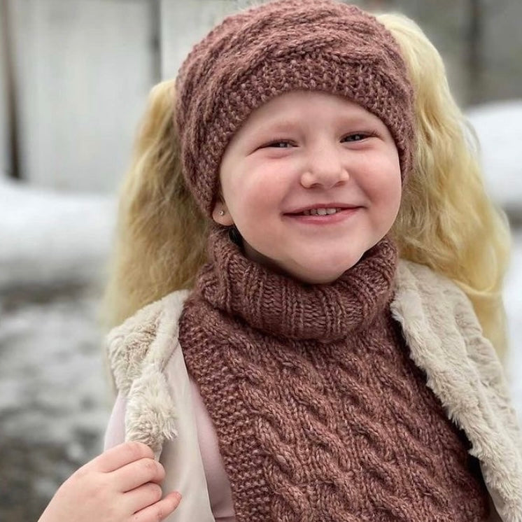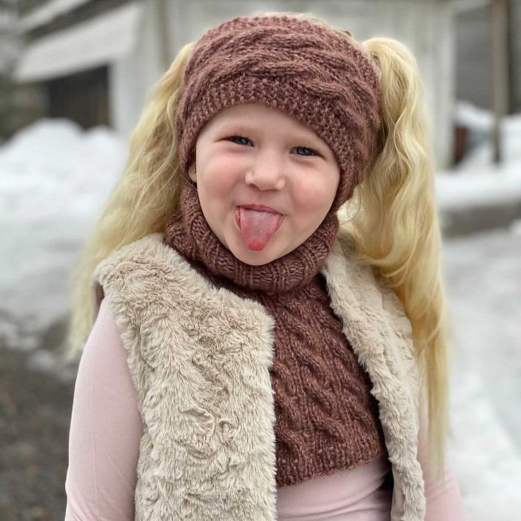 Mykt og komfortabelt sett for barn i størrelse 1-12 år. Vintersettet inneholder hals, pannebånd og lue strikket i nydelig kabelstrikk. Alle plaggene tøyes noe i bruk, og vil derfor holde lengre enn størrelsene tilsier.