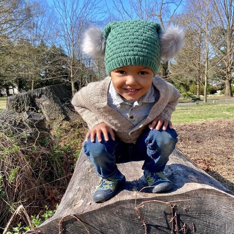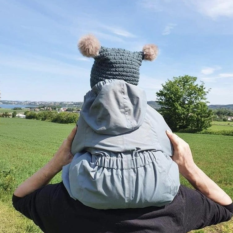 Veldig kjappstrikket lue med to dusker i toppen. Elastisk, lett å tre av/på, myk og behagelig med god passform.