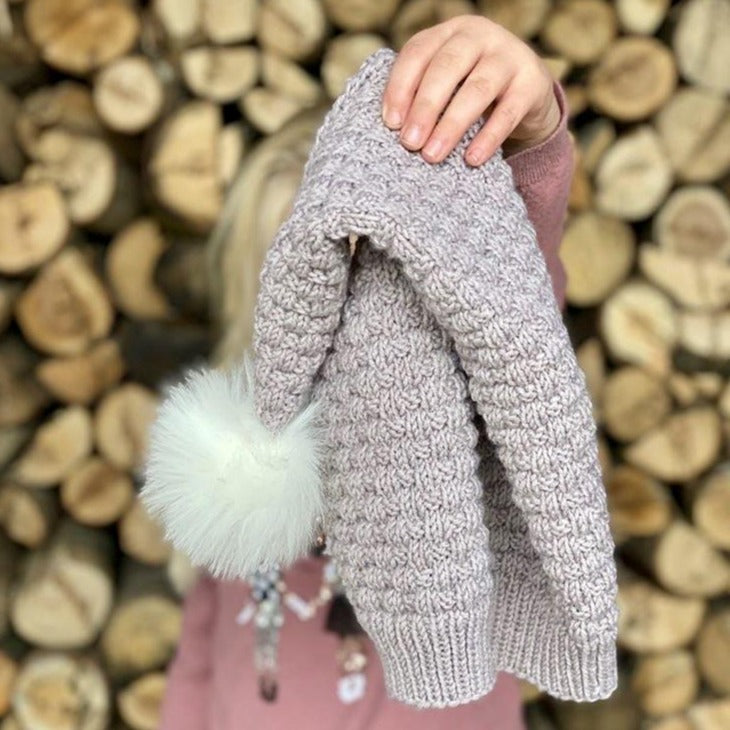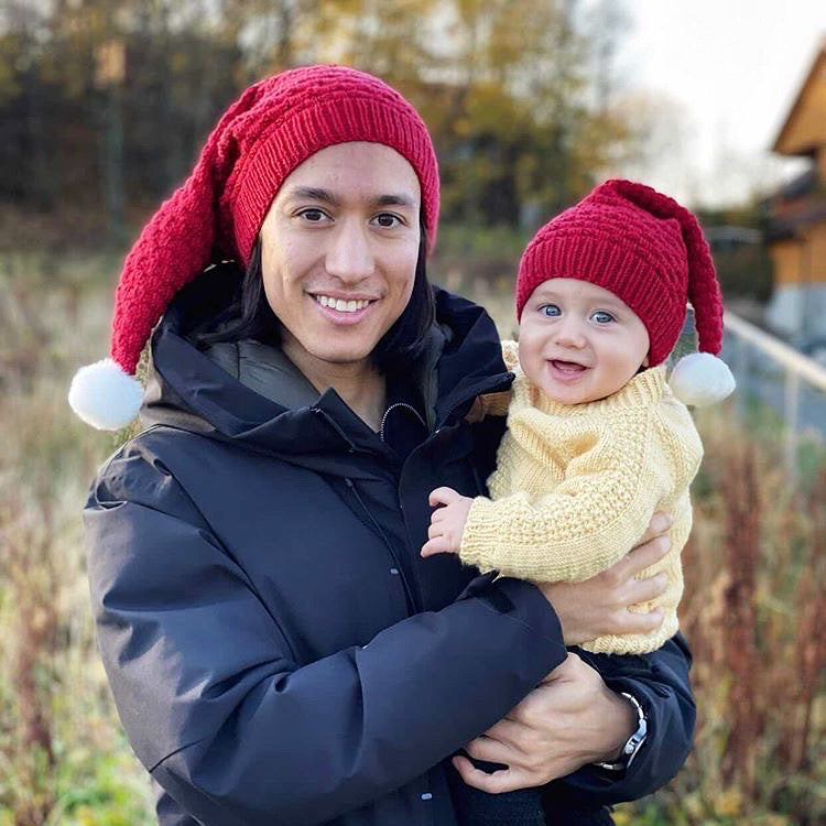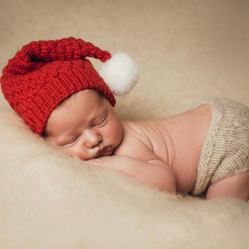 Fin, klassisk nisselue til små og store. Nisseluen kommer i størrelser fra nyfødt til voksen. Den er kjappstrikket på pinne 4 mm. Luen er myk og tøyelig, og sitter godt på. Super til julefeiring, fotografering og nissefest!